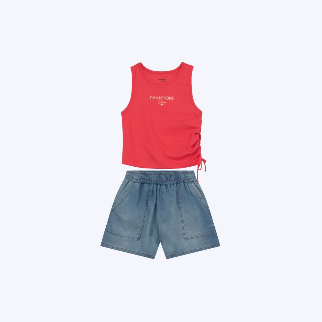 Este conjunto infantil feminino da Brandili, é a escolha perfeita para o verão. A blusa regata preta é confeccionada em ribana 100% algodão, garantindo leveza e respirabilidade, e apresenta um moderno detalhe de amarração lateral ajustável, com um bordado frontal que remete à palavra 'Champions', adicionando um toque de atitude. O shorts, com visual de jeans, é na verdade feito em moletinho 100% algodão, proporcionando um toque macio e máximo conforto para a sua menina. Possui bolsos práticos na frente e um cós elástico que se adapta perfeitamente ao corpo. Ideal para o dia a dia, passeios e momentos de lazer, este conjunto Brandili é projetado para meninas na faixa etária de 10 a 18 anos, combinando praticidade e tendência em uma única peça.