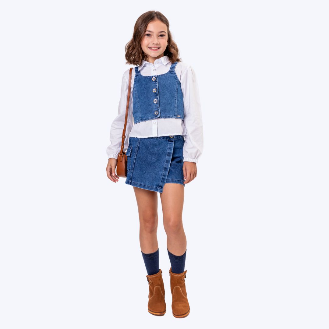 Conjunto Blusa Social Manga Longa com Colete Jeans de Alça e Shorts-Saia Jeans Infantil Menina Vigat
