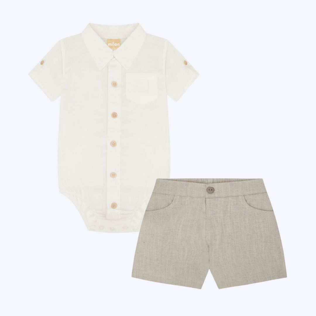 O Conjunto Body Manga Curta e Bermuda Sarja Bebê Menino Milon é a opção perfeita para vestir o seu bebê com estilo e conforto, seja em passeios casuais ou em momentos especiais. Este conjunto traz um toque de sofisticação e modernidade para o guarda-roupa do pequeno, sem abrir mão da praticidade e conforto.
