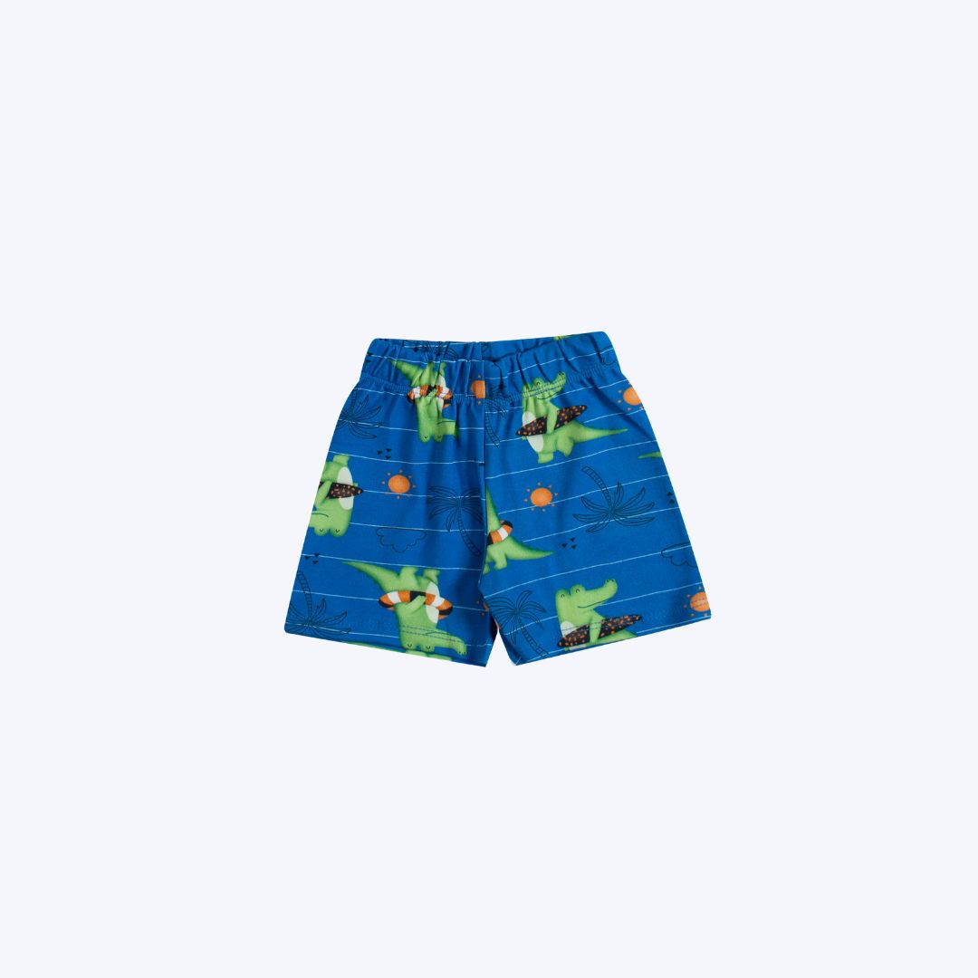 Design com estampa de jacaré de boia localizada no body e estampa rotativa de jacaré e elementos de praia no shorts, super divertido e tropical.