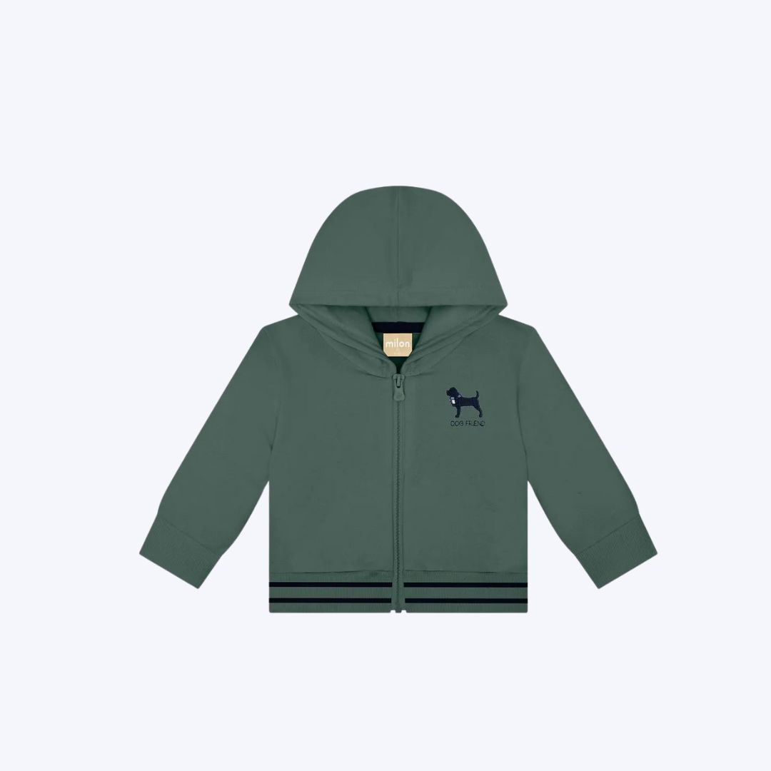 O grande destaque do conjunto é o casaco em moletom peluciado 100% algodão, que une aquecimento leve com um visual encantador. Com capuz funcional, fechamento em zíper frontal e bordado delicado de cachorrinho, essa peça traz proteção extra contra o frio e um toque lúdico que traduz a ternura da infância com muito estilo.
