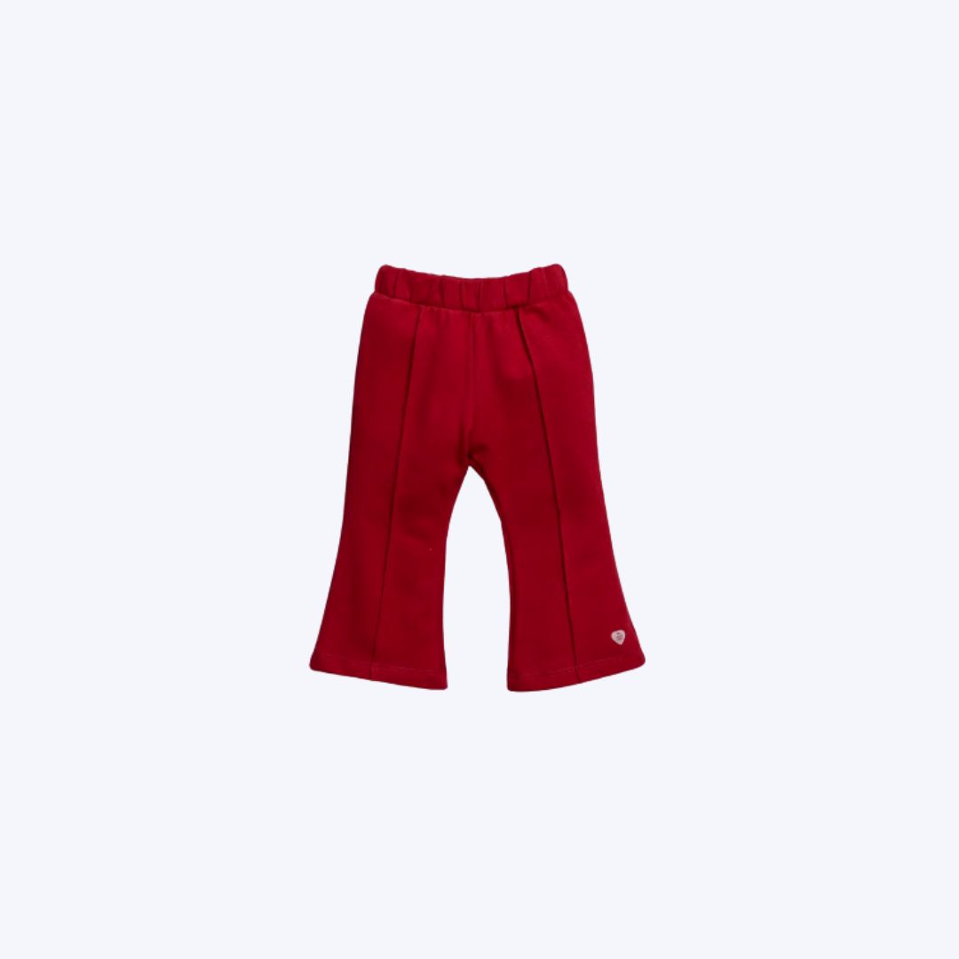 A calça, em tom vermelho vibrante, é feita em molecotton — tecido leve, flexível e muito confortável — proporcionando liberdade de movimento para brincar e explorar.