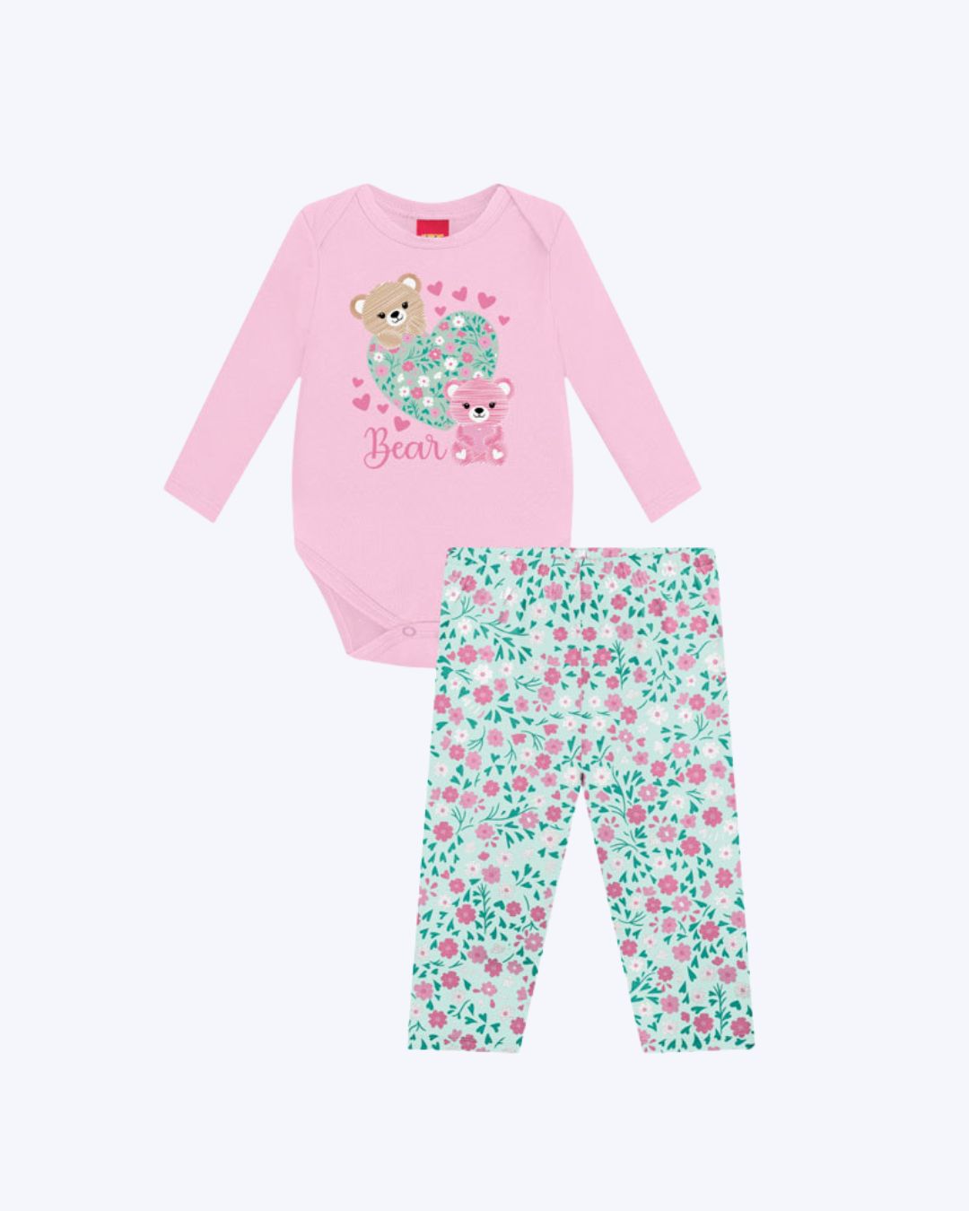 Design encantador: O body apresenta estampa localizada de ursinhos e flores, enquanto a legging exibe uma estampa rotativa floral, criando um visual doce e harmonioso.