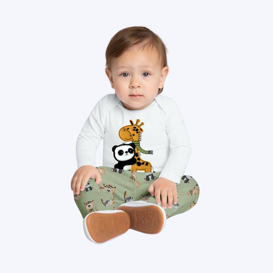 O Conjunto Body Manga Longa e Calça Moletom Bebê Menino Kyly é uma combinação perfeita de conforto, fofura e estilo para o seu pequeno. O body de manga longa, confeccionado em 95% algodão e 5% elastano, oferece suavidade e elasticidade, proporcionando liberdade de movimento e conforto durante o dia todo. O destaque fica na estampa bordada, mostrando um panda abraçando uma girafa, uma cena encantadora que traz um toque lúdico e divertido à peça.