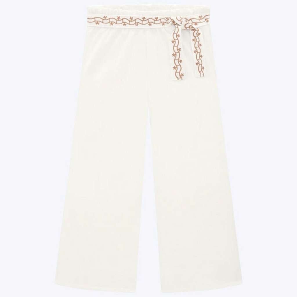 A calça complementa perfeitamente o visual sofisticado da blusa. Com uma faixa fixada em molde e o mesmo bordado em ponto cheio vazado que adorna a blusa, ela mantém a harmonia estética do conjunto. Sem costura lateral, a calça garante um caimento impecável e sem irritações. Um short interno, preso na cintura e sem costura lateral, assegura que as meninas possam brincar livremente, sem abrir mão do estilo. A barra com bainha finaliza o conjunto de maneira elegante, conferindo um toque refinado que é ideal para festas, almoços familiares ou qualquer ocasião que exija um pouco mais de glamour.