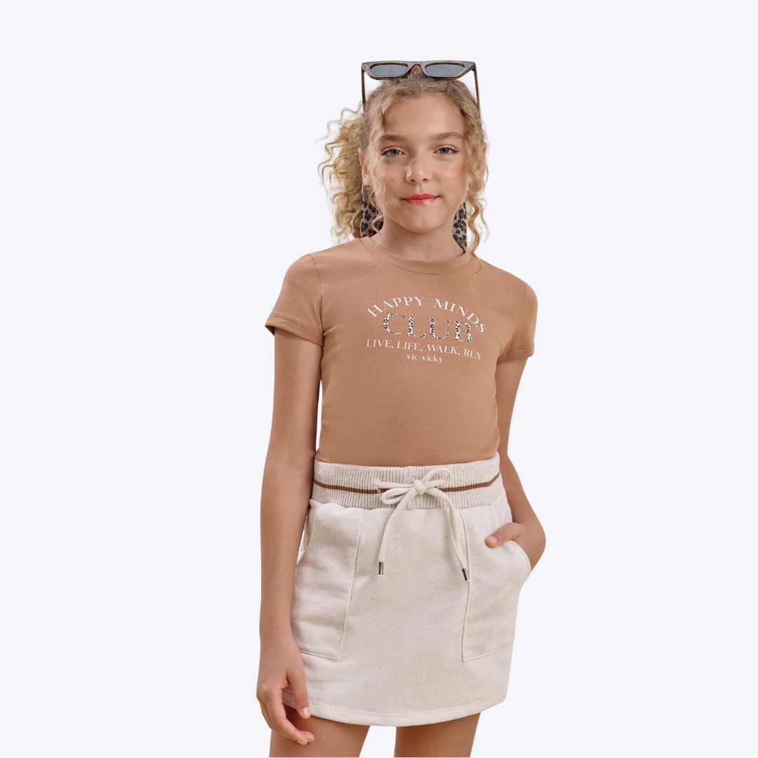 Design moderno e atual com a blusa baby look cropped e o prático shorts-saia, seguindo as tendências da moda juvenil.