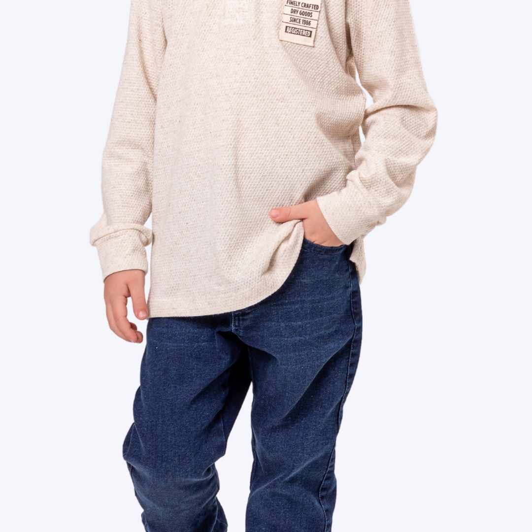 Acompanha uma calça jeans de lavagem azul escuro, que oferece um toque despojado e sofisticado ao mesmo tempo. Confortável e resistente, a peça garante liberdade de movimento e durabilidade para o dia a dia do seu pequeno.