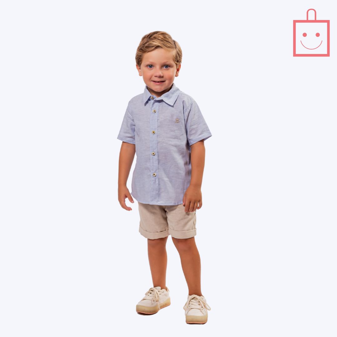 A camisa social do conjunto é confeccionada em tecido leve e de toque suave, ideal para os dias mais quentes. Com mangas curtas e botões de tom claro, a camisa traz um visual fresco e elegante, perfeito para ocasiões mais formais ou para passeios que exigem um toque de sofisticação. A gola tradicional e o corte clássico adicionam um ar de modernidade, enquanto o material respirável garante que seu filho fique confortável durante todo o dia, com liberdade para brincar e se movimentar.