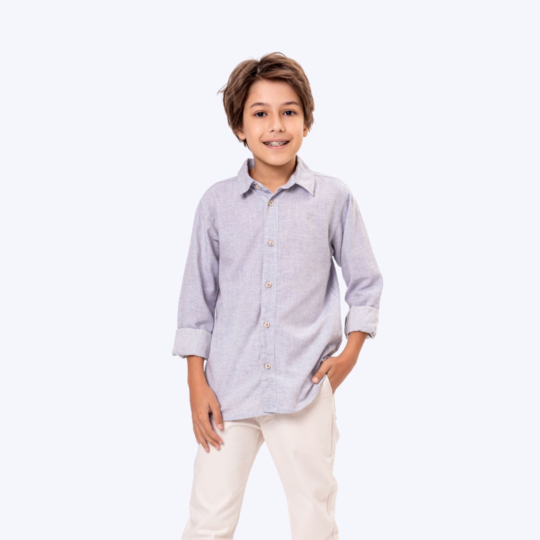 A camisa de botões manga longa oferece um toque de formalidade, enquanto a calça de sarja garante conforto e durabilidade para acompanhar as brincadeiras.
