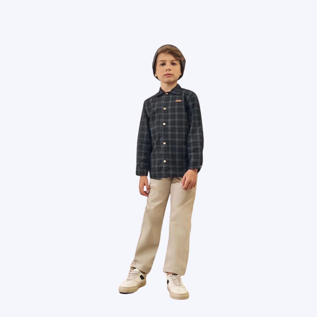 A camisa infantil xadrez é confeccionada em flanela 100% algodão, com gola tradicional, abertura frontal com botões e acabamento de alfaiataria nas mangas, garantindo um visual sofisticado e alinhado. Ideal para festas, eventos familiares e momentos que pedem um look mais elegante.