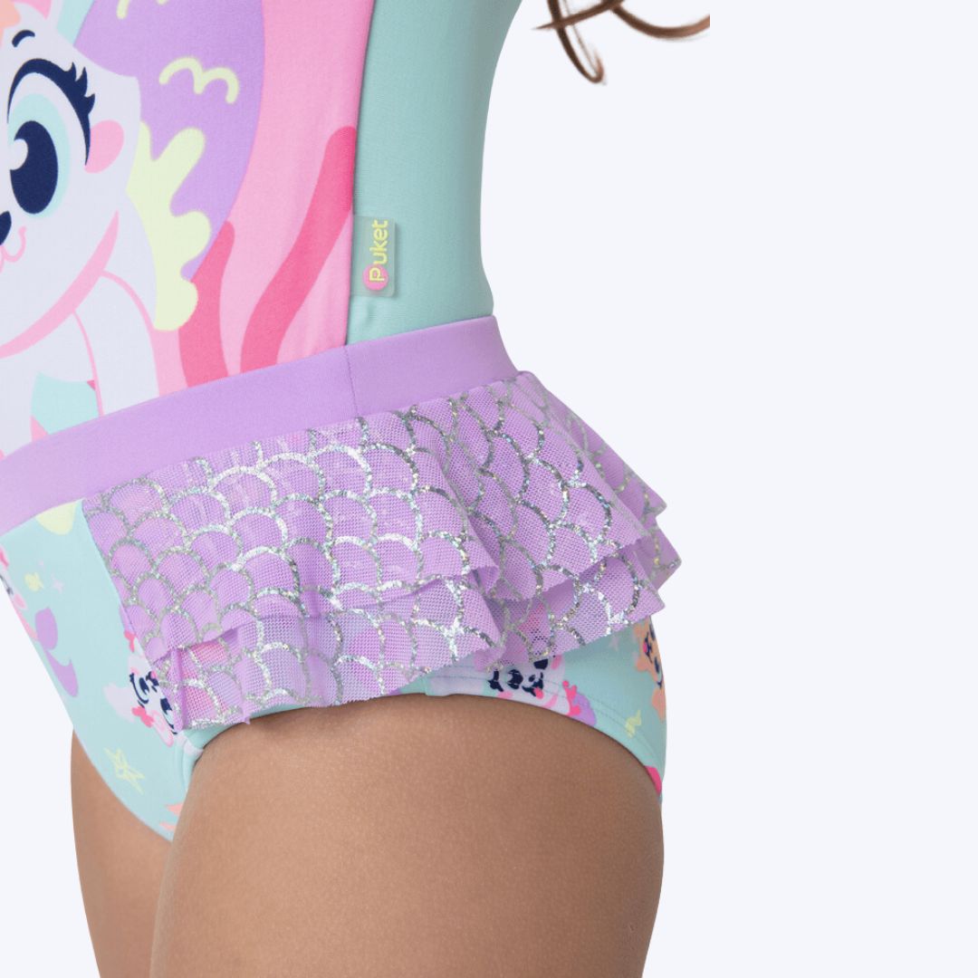 A calcinha segue o estilo da camiseta com uma estampa corrida rotativa e um detalhe de babado em tule na lateral, oferecendo um toque especial que combina perfeitamente com a camiseta. O conjunto é confeccionado com materiais de alta qualidade, sendo 85% poliéster e 15% elastano na parte externa, garantindo alta resistência ao cloro e conforto durante as atividades aquáticas. Já o tecido interno (90% poliamida e 10% elastano) proporciona maior elasticidade e conforto para a criança.