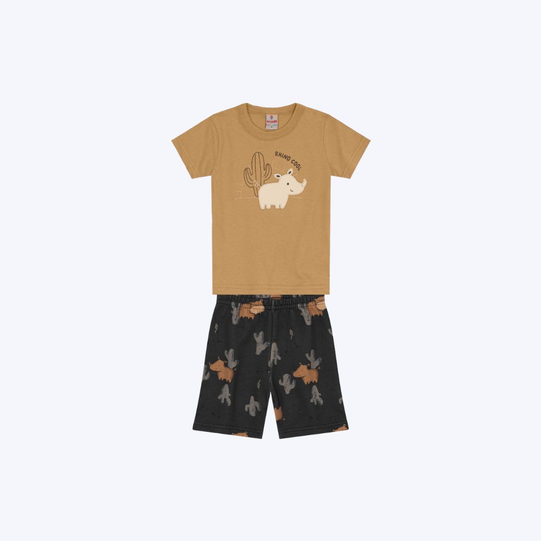 A estampa de rinoceronte na camiseta e a estampa rotativa na bermuda criam um visual divertido e moderno, ideal para o público infantil masculino.