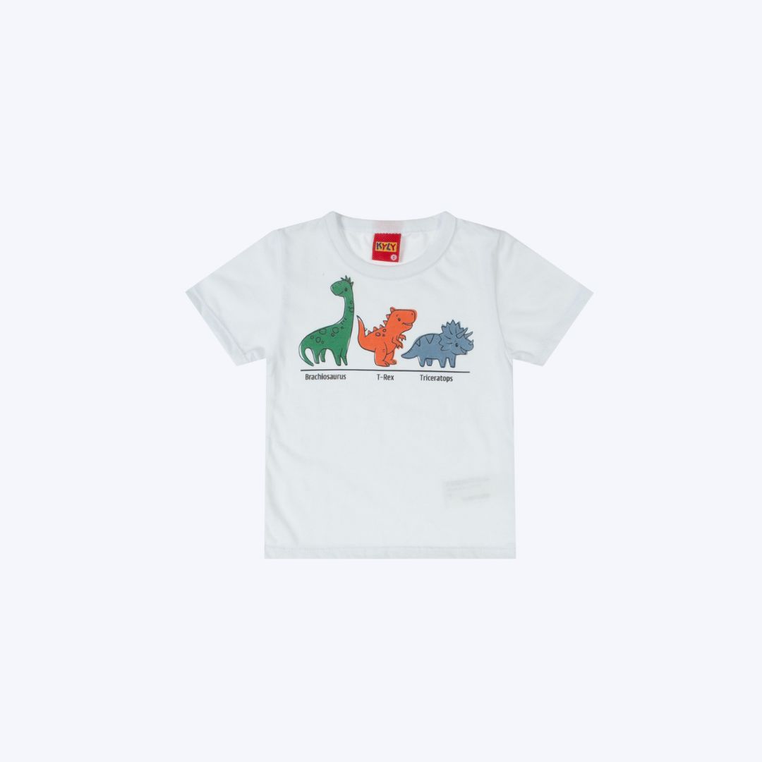 A camiseta possui uma estampa emborrachada de dinossauros, adicionando um toque lúdico e duradouro ao design.