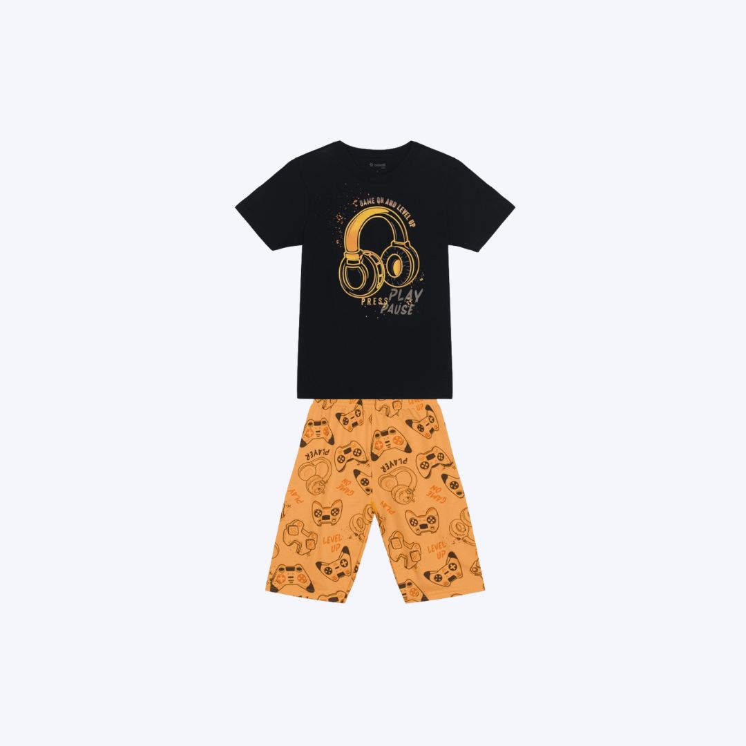 Tipo de Estampa: Estampado (Headphone na camiseta e rotativa de videogame na bermuda)