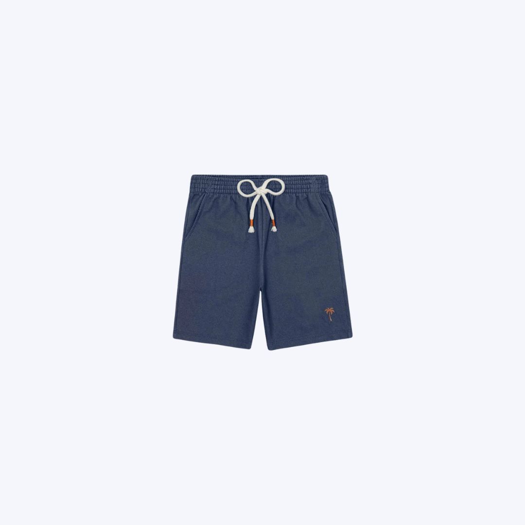 Bermuda em molecotton denim com cadarço ajustável e bolsos funcionais, unindo a praticidade do jeans com o conforto do moletom.