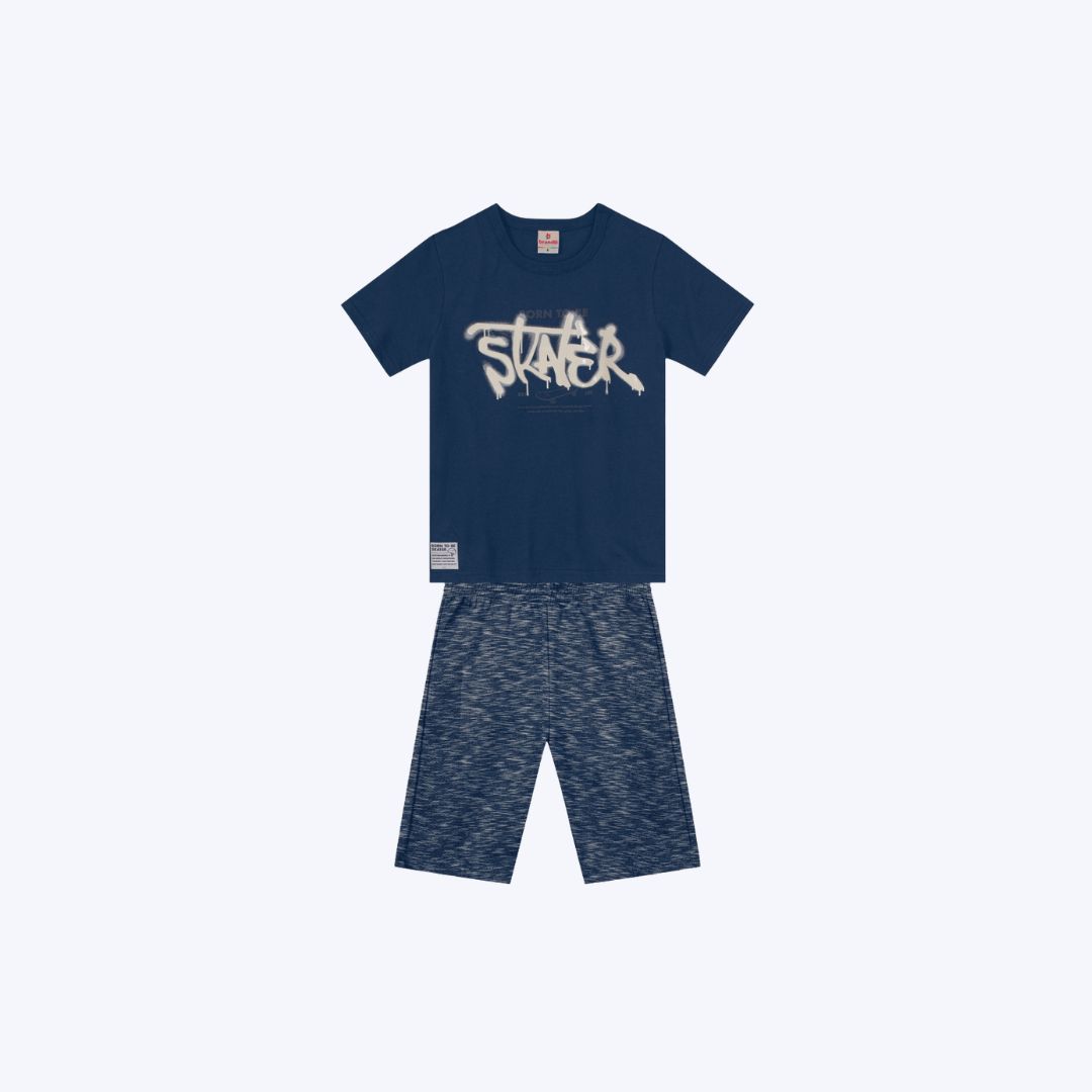 A estampa 'skater' na camiseta adiciona um toque divertido e estiloso, tornando o conjunto perfeito para diversas atividades.