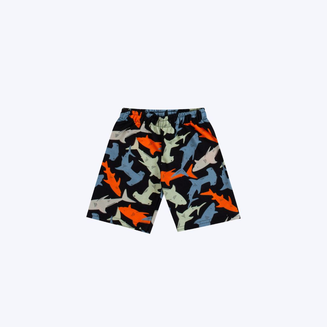 Design exclusivo com estampa de sharks na regata e estampa rotativa de tubarões na bermuda, trazendo um visual divertido e moderno.