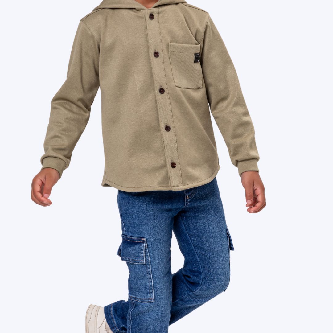 O casaco verde militar é uma peça robusta e cheia de atitude, com manga longa e fechamento por botões. A cor verde militar confere ao conjunto um toque de rusticidade e estilo urbano, além de ser facilmente combinada com outras cores e peças. O capuz adiciona um elemento extra de proteção contra o frio, sendo uma ótima opção para dias mais gelados. O tecido do casaco é macio e confortável, garantindo que o menino se sinta à vontade enquanto brinca ou se aventura ao ar livre, com a resistência necessária para enfrentar os desafios do dia.