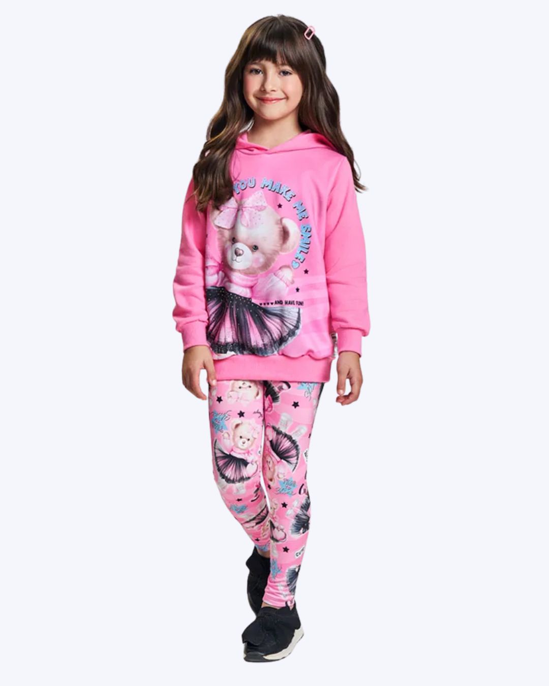 "Prepare-se para deixar os dias de frio muito mais alegres com este Conjunto Infantil Feminino de Inverno, uma peça essencial que combina o toque lúdico da marca Cinti com o máximo conforto. O conjunto é composto por um blusão alongado com capuz e uma calça legging, ambos confeccionados em suplex felpado, garantindo um toque macio e excelente proteção térmica para as crianças. O blusão destaca-se pela estampa encantadora de uma ursinha bailarina, finalizada com detalhes em strass que trazem um brilho delicado e especial à peça.