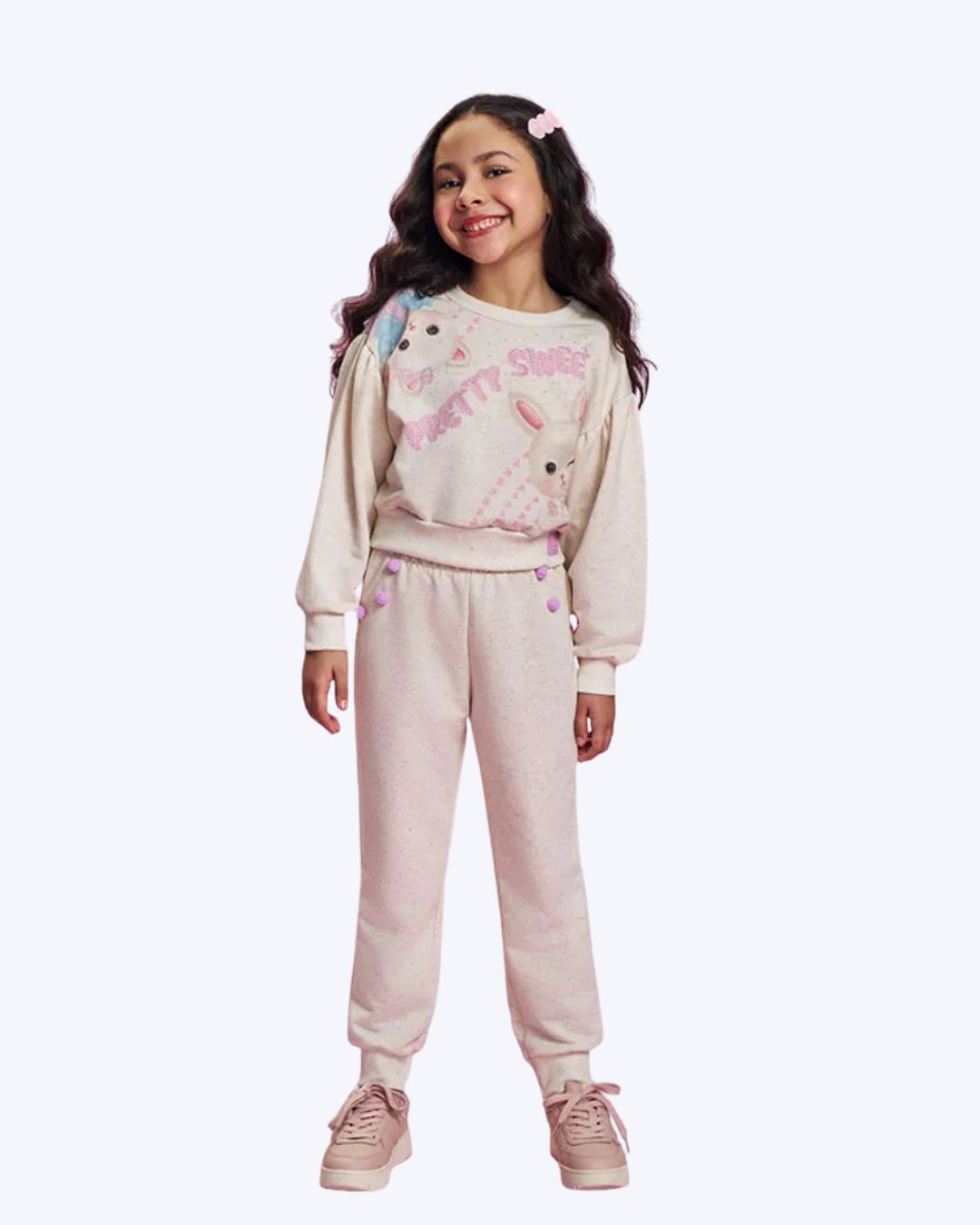 "O conjunto infantil feminino da Cinti une a sofisticação visual do linho com o conforto imbatível do moletom, sendo a escolha perfeita para um inverno leve e cheio de estilo. O blusão apresenta a moderna modelagem boxy, com um caimento mais soltinho e atual, destacando-se pelas mangas com ombros franzidos que conferem um volume delicado e romântico. Para garantir o ajuste ideal e o conforto térmico, a peça conta com acabamentos em ribana de alta qualidade nos punhos e na barra. A calça no estilo jogger completa o duo de forma prática, possuindo cós com elástico rebatido que se adapta perfeitamente ao corpo da criança, permitindo total liberdade para brincar. O charme lúdico deste conjunto reside em seus detalhes minuciosos: a estampa frontal é enriquecida com aplicações de strass, que adicionam um brilho sutil e mágico à peça. Um detalhe irresistível são os pompoms coloridos aplicados nos bolsos da calça, que trazem um elemento tátil e divertido para o visual. Confeccionado em moletom linho sem felpa, o conjunto oferece uma respirabilidade excelente, sendo ideal para regiões com invernos amenos ou para ambientes internos, mantendo a pequena estilosa sem superaquecer. Este conjunto é extremamente versátil, sendo ideal para passeios em família, festas de aniversário diurnas ou um dia de lazer especial. Por ter um visual clean e sofisticado, ele combina maravilhosamente bem com um tênis casual ou uma sapatilha moderna. Para um look completo, adicione um laço de cabelo em tons neutros para harmonizar com a textura do linho. Em dias de vento, a sobreposição com um colete leve garante proteção extra mantendo a estética comfy chic que é tendência na moda infantil."