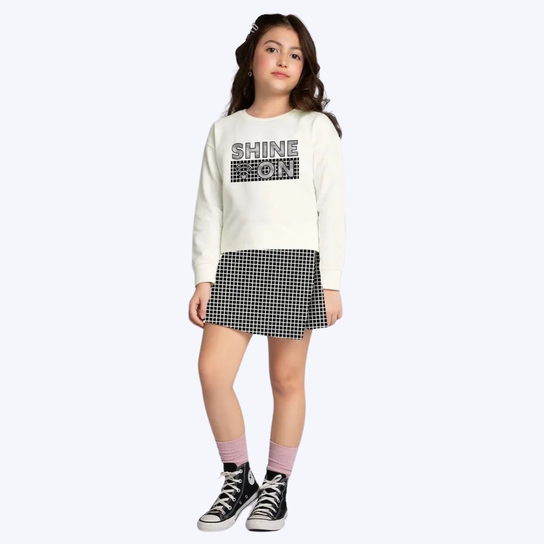 O short-saia, também em moletinho sem felpa 100% algodão, possui uma estampa rotativa de quadradinhos que adiciona um toque moderno e estiloso à peça. Além disso, o cós com elástico garante um ajuste perfeito, proporcionando liberdade de movimento para que as pequenas possam brincar e se divertir com total conforto.