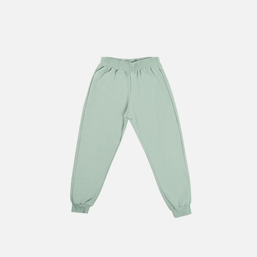 ?Calça Moletom com Punho: A calça, também em verde claro, possui punhos na parte inferior, proporcionando um ajuste perfeito e moderno.