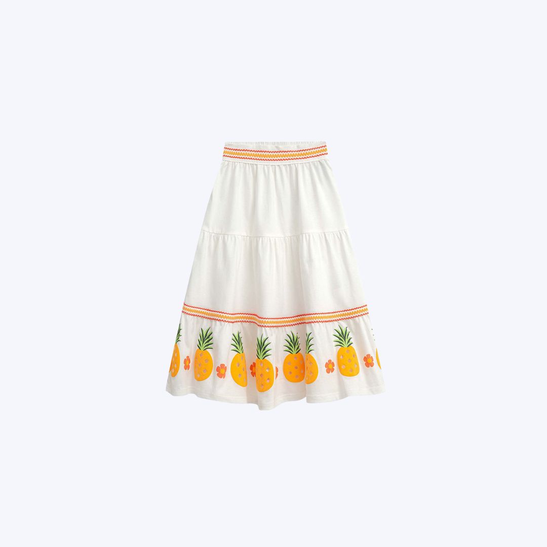 A saia midi em camadas foi cuidadosamente desenhada para oferecer um volume suave e um movimento gracioso, realçado por aviamentos que complementam a estampa de abacaxis na barra.
