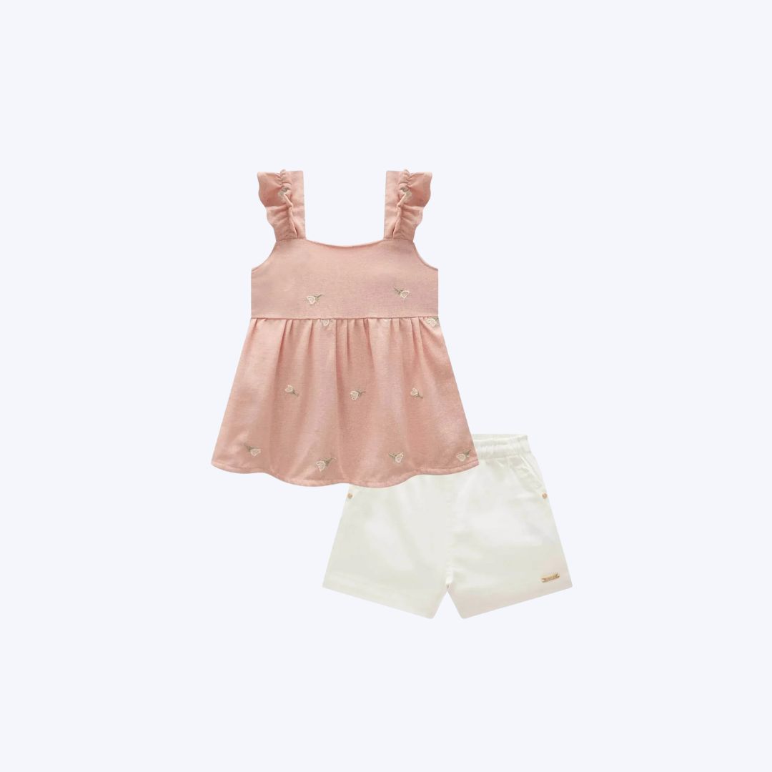 Conjunto De Bata Em Linho Bordado Flores e Shorts Em Sarja Com Elastano Bebê Menina Infanti