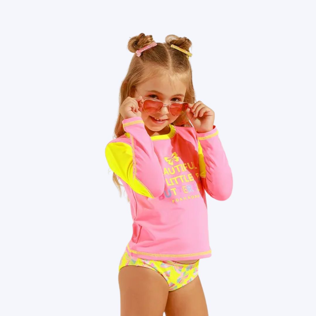 O Conjunto de Nadar Borboleta Poah Noah é a opção ideal para as meninas desfrutarem dos dias ensolarados com total liberdade e segurança. Confeccionado em lycra premium de alta qualidade, este kit beachwear infantil garante proteção UV 50+ contra os raios solares, essencial para a pele delicada. A blusa de manga longa bicolor rosa e amarela, com gola redonda e uma divertida estampa de borboleta na frente, combinada com uma calcinha básica confortável com estampa total de borboletas em fundo amarelo, cria um visual alegre e encantador. Projetado para proporcionar o máximo conforto e mobilidade em atividades aquáticas, seja na piscina ou na praia, este conjunto da Poah Noah é a combinação perfeita de funcionalidade e estilo para o verão.