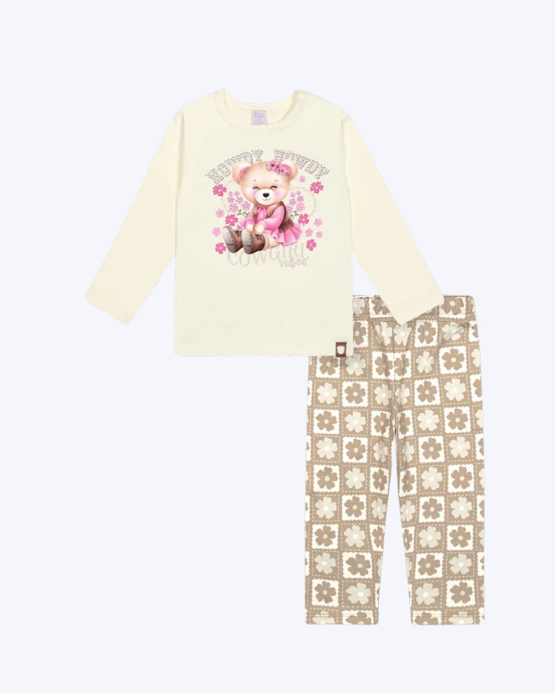 "O Conjunto Blusa e Legging é a combinação perfeita de conforto e estilo, ideal para os dias mais frios com um visual floral e aconchegante. Blusa: Confeccionada em Cotton, a blusa de mangas longas oferece um toque suave. Para facilitar ao vestir, possui abertura com botão de pressão no decote. A estampa sublimada central traz uma ursinha vestida de cowgirl com a escrita ""HAPPY COWGIRL"", cercada por florzinhas. O detalhe de brilho é garantido pelo strass, que adiciona um charme delicado. Legging: A calça é feita em Suplex Felpado, garantindo elasticidade, toque suave e quentinho. Possui cós elástico rebatido, oferecendo um ajuste seguro. A legging conta com sublimação rolo em toda a peça, com uma padronagem divertida e clássica de flores em cores coordenadas com a blusa. Este conjunto, é ideal para criar um visual completo, aconchegante e cheio de charme campestre para a sua bebê."