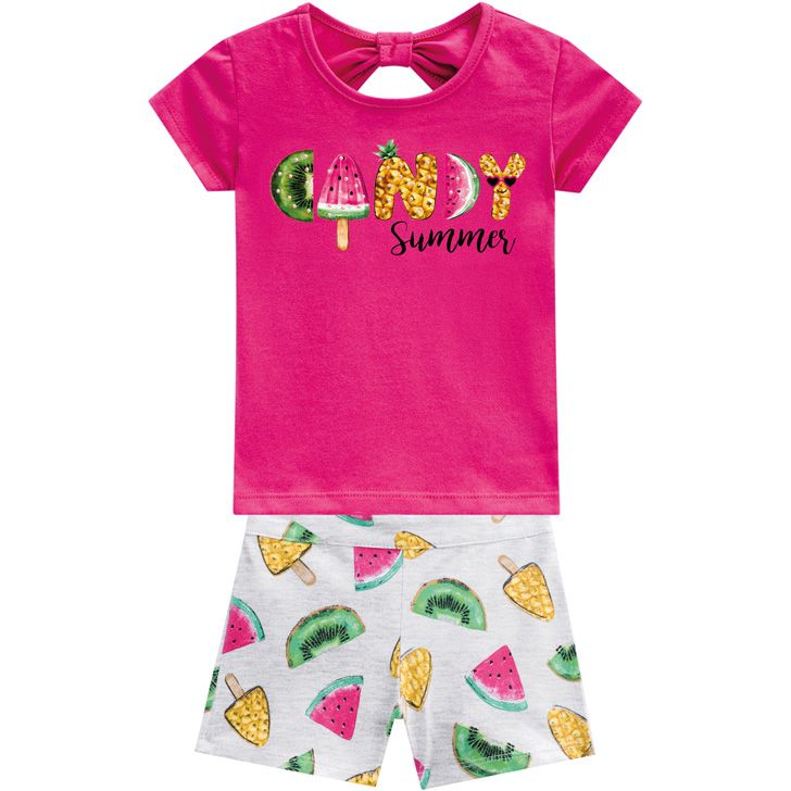 Conjunto infantil feminino da marca nacional Kyly, ocnfeccionado com tecido de qualidade trazendo um conforto maior a criança. Composto por um  blusa manga curta escrito CANDY com fruta, detalhe aberto nas costas. Short possui cós com elástico, estampa rotativa de frutas. Modelo de conjunto super fofo e confortável, perfeito para o dia a dia. Na Se-An Junior Moda Infantil você encontra toda linha de conjuntos Kyly.