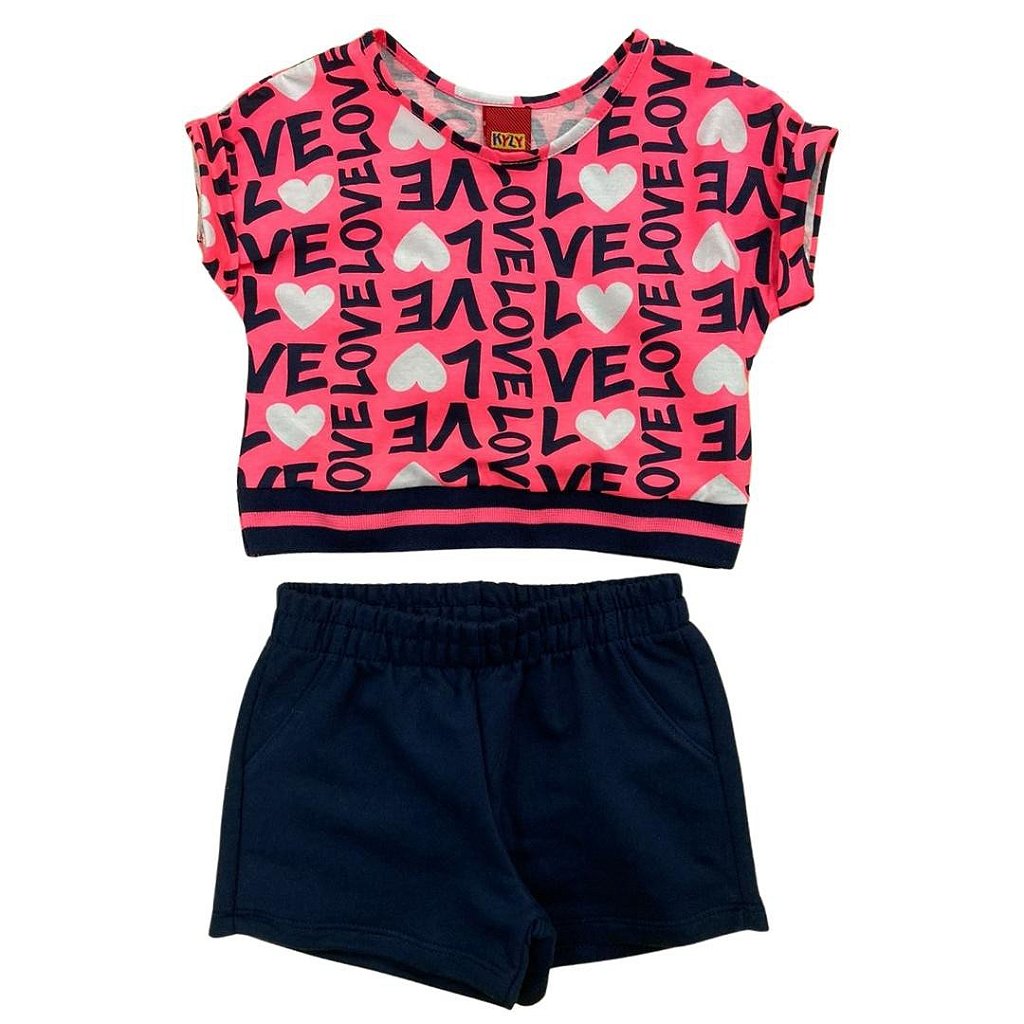 Roupa infantil feminina da marca Kyly, confeccionado com tecido de qualidade, trazendo um conforto maior a criança. Composto por uma blusa de manga curta, escrito love e com vários corações, possui elástico na barra. Short básico com elástico no cós, não possui bolsos.
