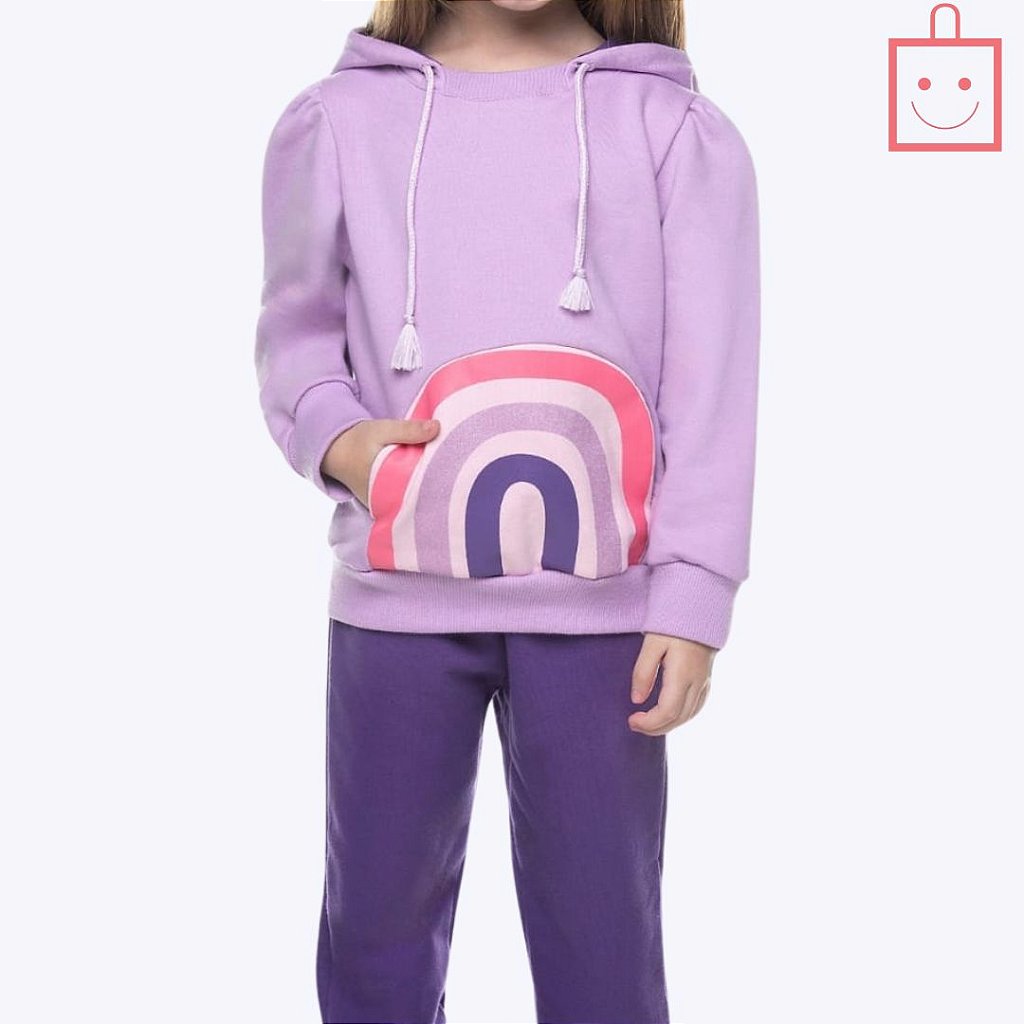 O casaco em moletom lilás é o destaque deste conjunto, com uma estampa vibrante de arco-íris que adiciona um toque de magia e encanto ao visual. Esta explosão de cores traz um sorriso aos rostinhos das meninas e reflete sua personalidade vibrante e brilhante.