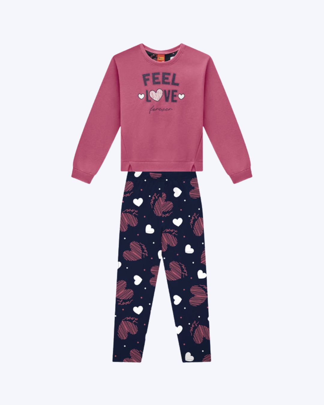 Design moderno e lúdico com lettering "feel love" no casaco e estampa de coração na legging, que adicionam um charme especial.