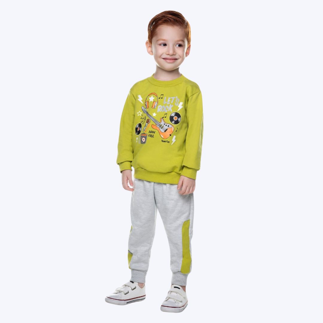 Apresentamos o vibrante Conjunto Moletom Estampado Infantil Masculino da adorada linha Have Fun. Este conjunto é uma celebração da música e do estilo, perfeito para os pequenos que têm um espírito rock'n'roll desde cedo.