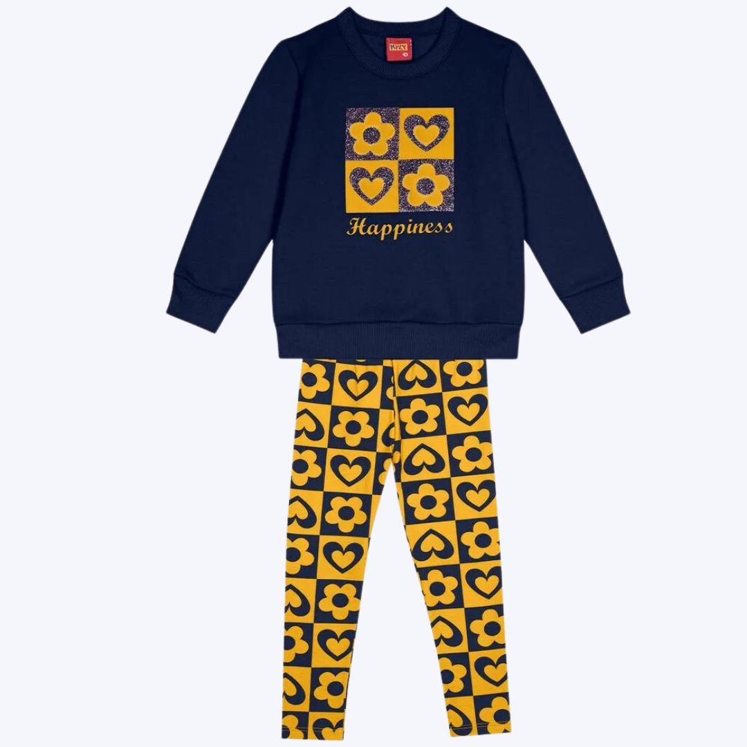 A calça, em cotton, possui uma estampa rotativa igualmente charmosa de flores e corações, proporcionando um visual divertido e feminino. O elástico rebatido na cintura garante um ajuste seguro e confortável, permitindo liberdade de movimento para brincadeiras e atividades do dia a dia.
