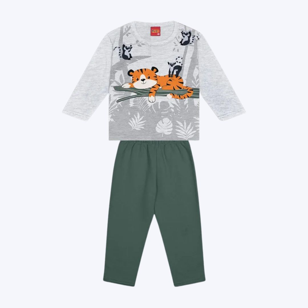 O Conjunto Infantil Masculino Kyly é a escolha ideal para manter os pequenos não apenas confortáveis, mas também cheios de estilo. A camiseta, confeccionada em meia malha 100% algodão, garante uma sensação suave ao toque, perfeita para o uso diário. Decorada com uma encantadora estampa localizada de bichinhos, adiciona um toque lúdico e divertido ao visual dos meninos. Seu decote redondo com acabamento em debrum e mangas longas proporcionam um ajuste confortável e seguro, ideal para brincadeiras e atividades do dia a dia.