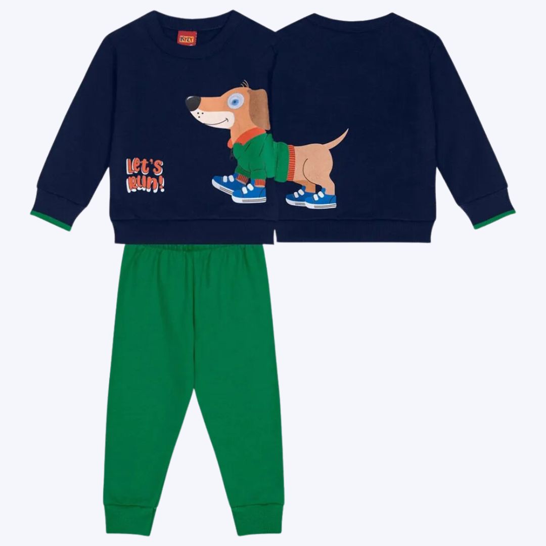 O grande destaque é o casaco, que apresenta uma estampa interativa encantadora de um cachorrinho. Esta divertida estampa começa na parte frontal, segue pelas mangas e termina nas costas, criando uma experiência visual única e alegre para as crianças. Um detalhe adorável é o aplique de olhinho no rosto do cachorro, adicionando um toque extra de fofura ao conjunto.