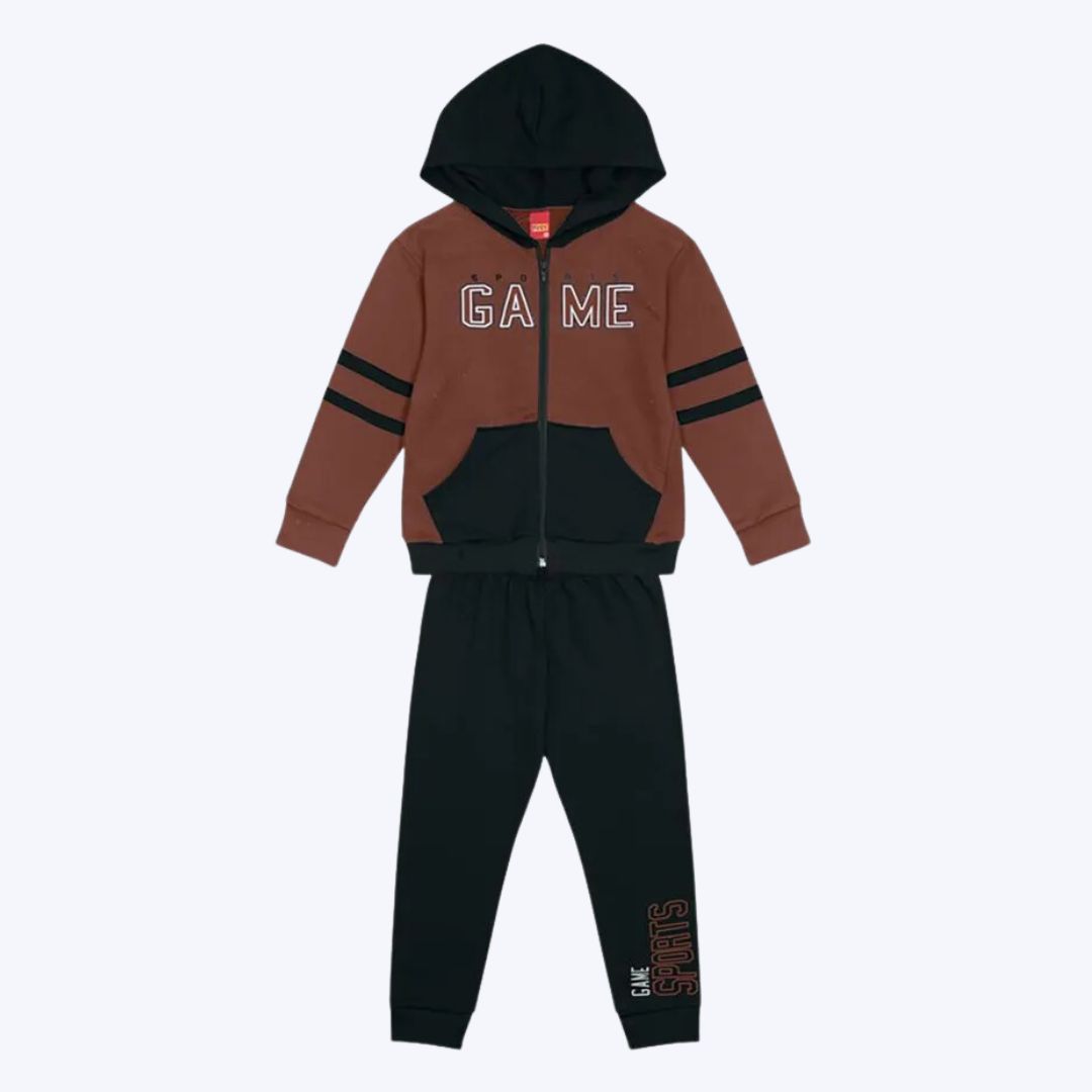 A jaqueta é o destaque, apresentando uma estampa localizada frontal com a escrita "GAME", adicionando um toque divertido e contemporâneo ao visual. Com bolso frontal e capuz em cores contrastantes, esta peça proporciona um estilo moderno e descolado. As mangas contam com aplicação de fitas em cores contrastantes na altura do cotovelo, adicionando um detalhe único e marcante. Os punhos e a barra possuem acabamento em molde, garantindo um ajuste perfeito, enquanto a abertura frontal por zíper oferece praticidade na hora de vestir.