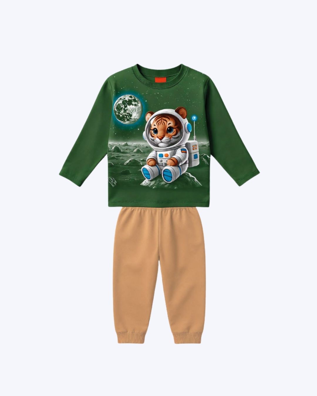 Design moderno e versátil com blusa estampada e calça lisa, facilitando a criação de looks variados para o menino no outono/inverno.
