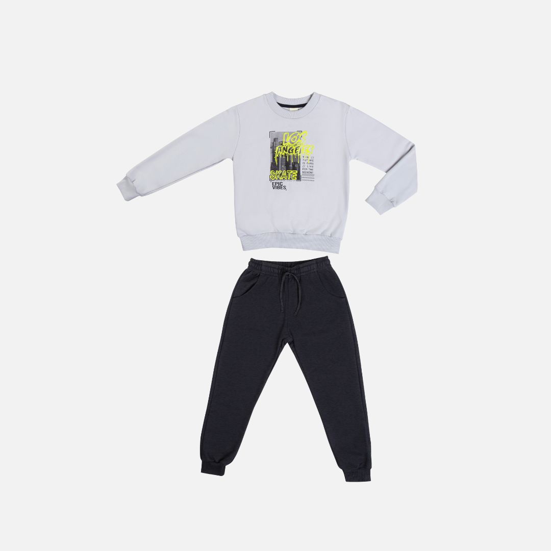 Disponível nas cores verde claro e cinza, o conjunto tem design clean e moderno, ideal para quem prefere um visual básico, mas cheio de personalidade. A modelagem confortável e o tecido macio proporcionam o bem-estar necessário para brincar, estudar ou passear com estilo e praticidade.