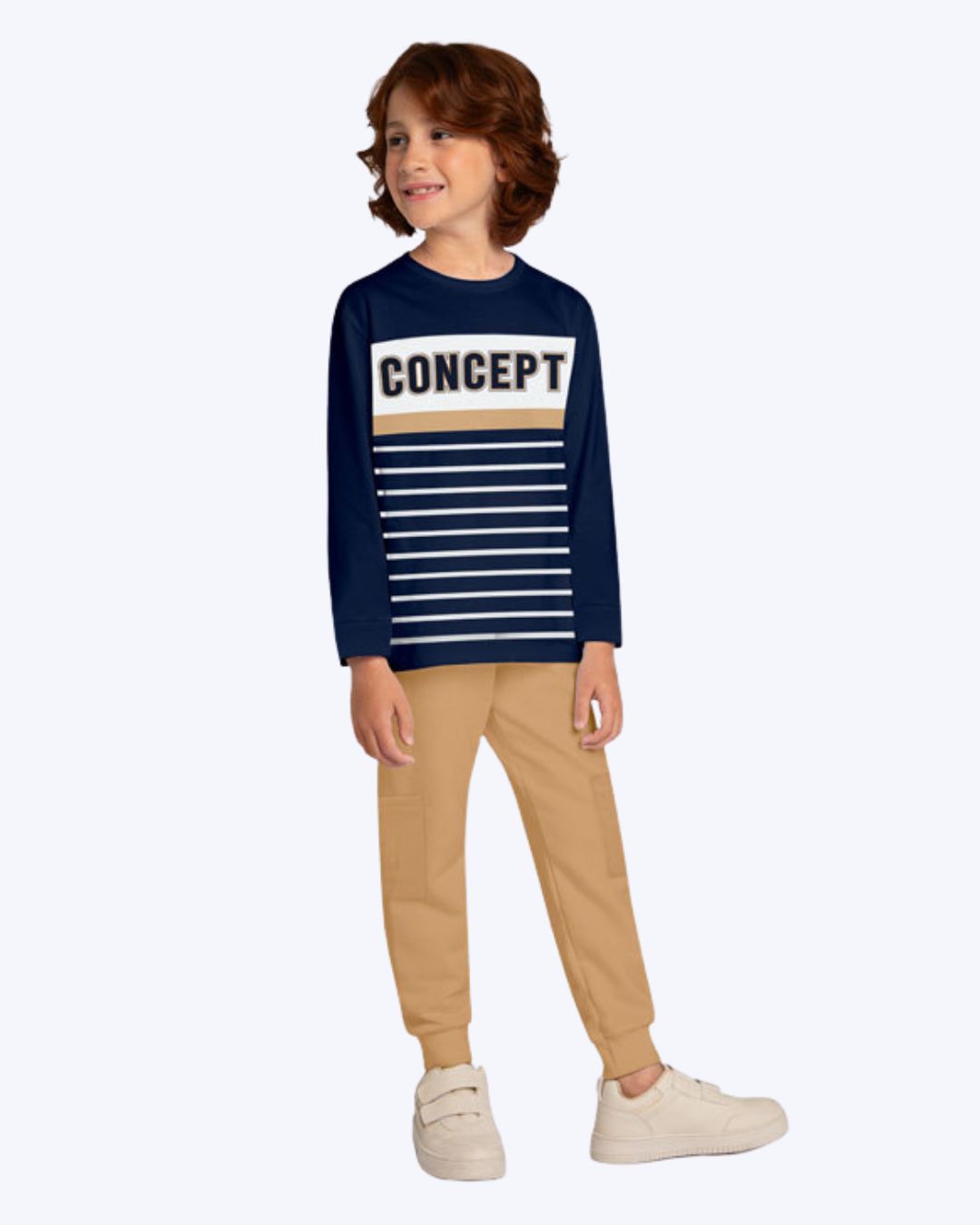 Estiloso e confortável, este conjunto infantil menino da Kyly é perfeito para acompanhar os pequenos em momentos de diversão e descobertas. Com uma proposta moderna e casual, a combinação traz elementos gráficos e modelagem confortável que valorizam o visual infantil com praticidade para o dia a dia. A camiseta é confeccionada em meia malha 100% algodão, oferecendo toque macio, respirabilidade e conforto ideal para a rotina dos meninos. A modelagem possui caimento leve e confortável, permitindo liberdade de movimentos durante as brincadeiras. O destaque da peça está na composição visual com estampa lettering “Concept” e listras horizontais, criando um contraste moderno e cheio de personalidade. As mangas longas e a gola redonda completam o design com um acabamento clássico e versátil.