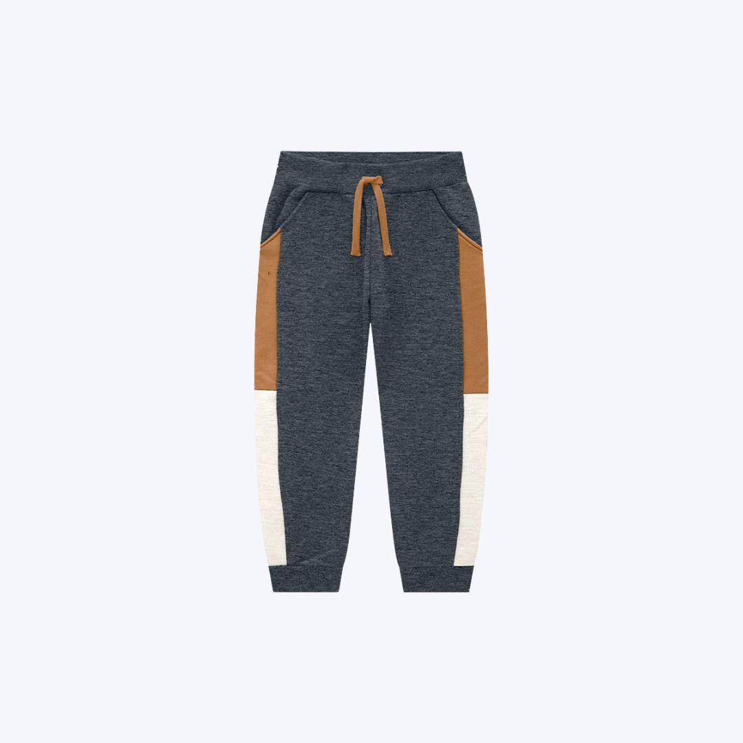 A calça, feita majoritariamente em moletom sem felpa 100% algodão, conta com detalhes estratégicos em tecidos mistos de algodão e poliéster, proporcionando maior resistência ao uso diário. O cós com elástico assegura um ajuste prático e seguro, permitindo que a criança se vista sozinha com facilidade e se movimente com total liberdade.