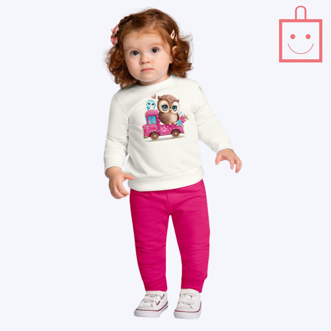 A blusa apresenta uma adorável estampa de corujinha, trazendo um toque de fofura e encantamento para o visual. O design é pensado para proporcionar conforto e liberdade de movimento, permitindo que a criança brinque e se divirta sem restrições. A calça de moletom, com ajuste elástico, oferece um caimento perfeito e muito conforto, tornando o conjunto ideal tanto para o dia a dia quanto para momentos de lazer.