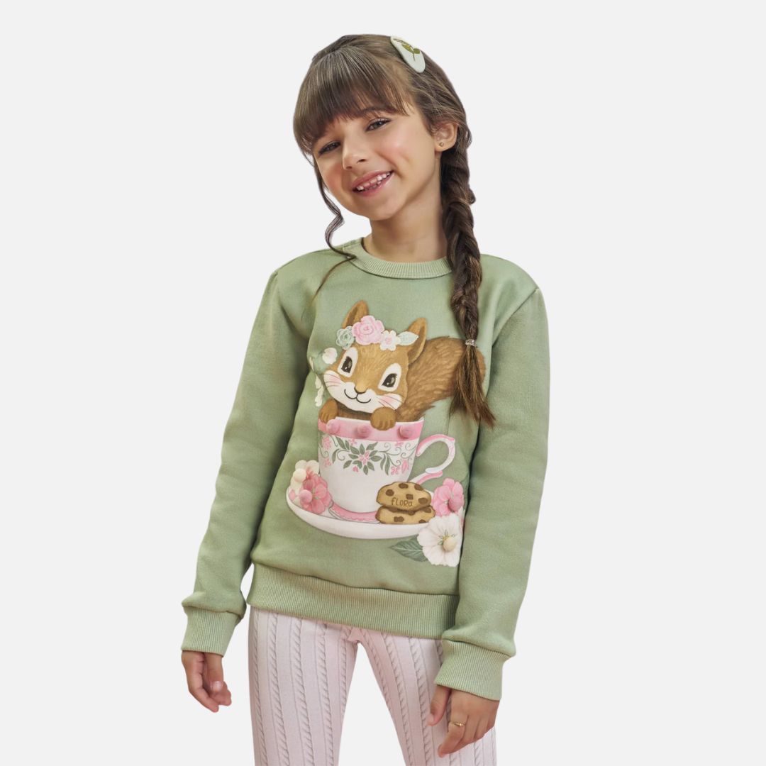 Deixe os dias frios mais divertidos e aconchegantes com o Conjunto Infantil Feminino Infanti, composto por blusão em moletom peluciado verde com estampa fofa de esquilo e calça legging em Termoskin peluciado. Um look perfeito para as pequenas curtirem o inverno com estilo, conforto e proteção térmica.