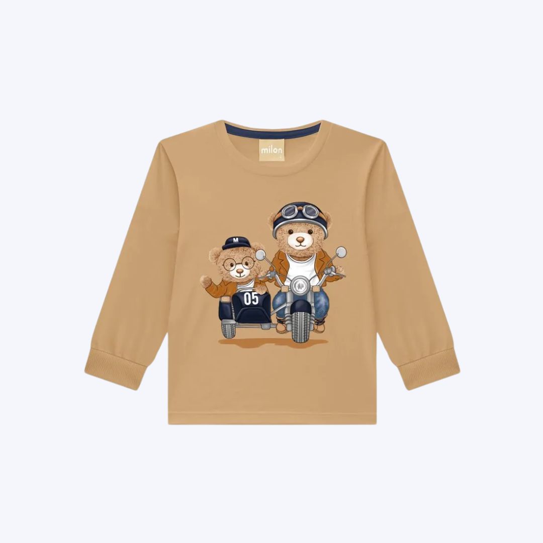 A camiseta é confeccionada em meia malha 100% algodão, proporcionando toque suave e respirabilidade, perfeita para qualquer estação. A estampa exclusiva com dois ursinhos andando de moto traz um visual criativo, moderno e divertido, estimulando o imaginário infantil com uma temática cheia de aventura.