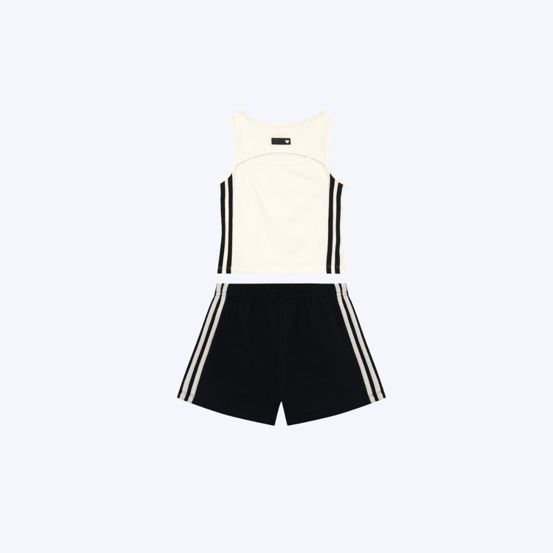 Com a blusa regata branca e o shorts preto, o conjunto oferece um look versátil que pode ser usado junto ou as peças separadamente, adaptando-se a diversas ocasiões e criando novas combinações com estilo.