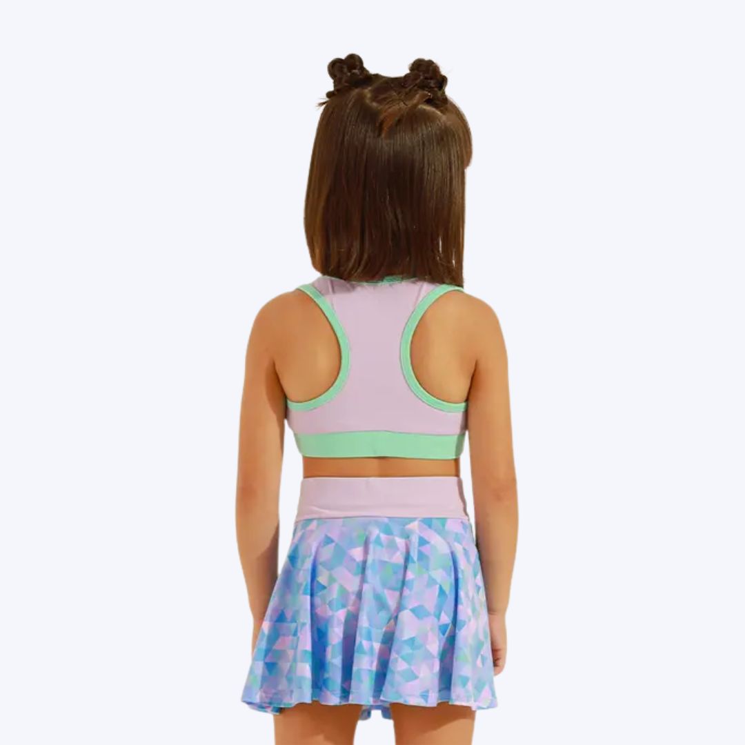 Este conjunto infantil é composto por um top e uma saia que se destacam pela combinação de cores vibrantes e design moderno. O top lavanda possui costas nadador e detalhes em turquesa que criam um contraste divertido. Sua estampa de alta definição traz uma energia especial ao visual, ideal para acompanhar o estilo ativo das meninas. A saia evasê com leve babado, em tons de lavanda sobre um fundo azul, complementa o look, enquanto o cós anatômico e o elástico embutido garantem um ajuste perfeito e confortável. O shorts de lycra embutido proporciona ainda mais liberdade de movimento, permitindo que as pequenas se divirtam sem restrições.
