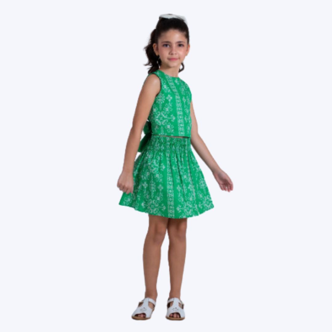 A blusa possui um design encantador com decote em U e um delicado recorte na parte frontal, além de amarração e abotoamento nas costas que permitem ajuste perfeito e praticidade. Já a saia, com cós largo de lastex, proporciona maior conforto, enquanto o short interno de malha de algodão assegura liberdade de movimento para as brincadeiras. A estampa exclusiva "Bordado Ponto Cruz" traz um charme artesanal e sofisticado, enriquecendo o visual de forma delicada.