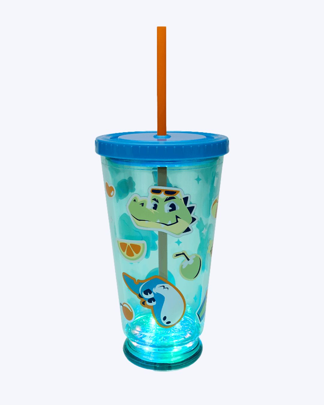 Copo em polipropileno com estampa de multibichos. Possui tampa e acompanha canudo. LED localizado na parte inferior (compartimento de LED removível para limpeza).